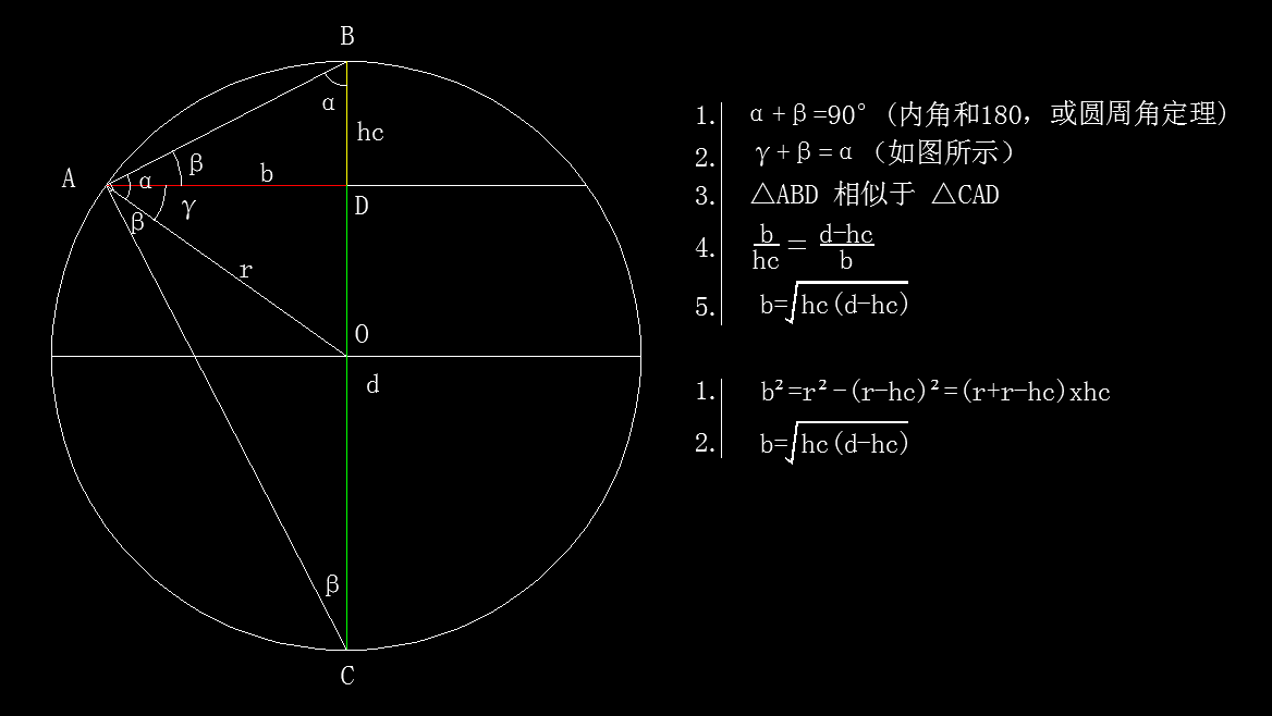 原木结构进行齿连接时,需要计算在齿深hc处的圆上弦长,作为齿承压面面积和剪面面积的计算前提。单独记忆公式是不人性的,特画个CAD图,把计算公式的来历描述一番,也是一种乐趣。